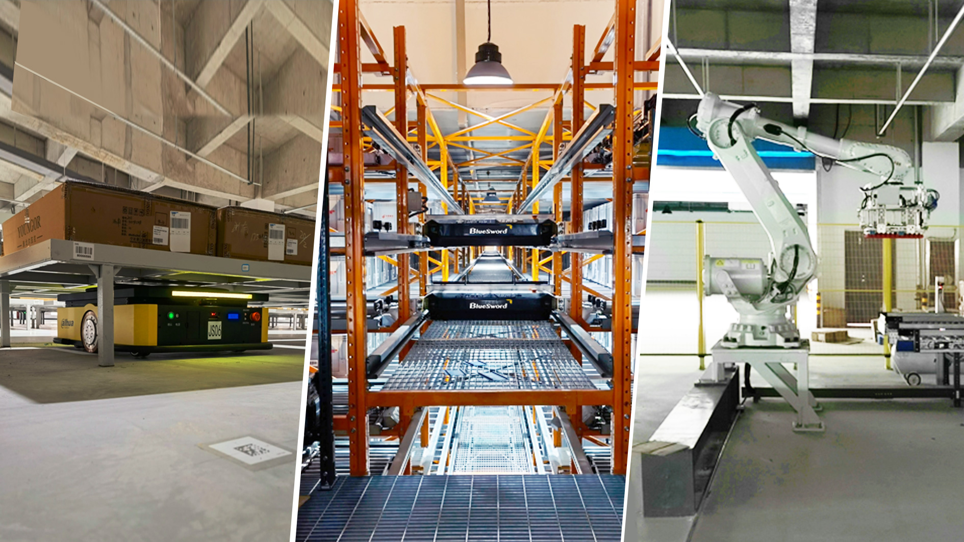 仓内可实现自动化仓储、自动化运送、自动化分拣,涵盖了意昂体育智能穿梭机械人、搬运机械人、拆码垛机械人等多款物流机械人。
