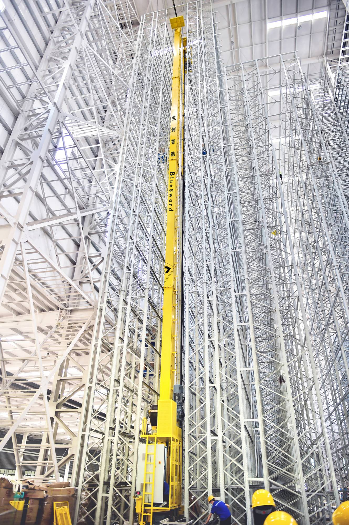 若是说笼统的数字难以形象地明确其高度之高,举几个例子让你遥遥遐想一下。假定住房层高3米(一样平常不到3米),堆垛机智能仓的高度就相当于有15层的小高楼房;比济南地标——泉标(高38.11米),还要高上几米;在现场仰头看堆垛机上横梁,需要用手扶着工程帽,由于不止王冠会掉,帽子也会掉,令人不得不赞叹仰之弥高!